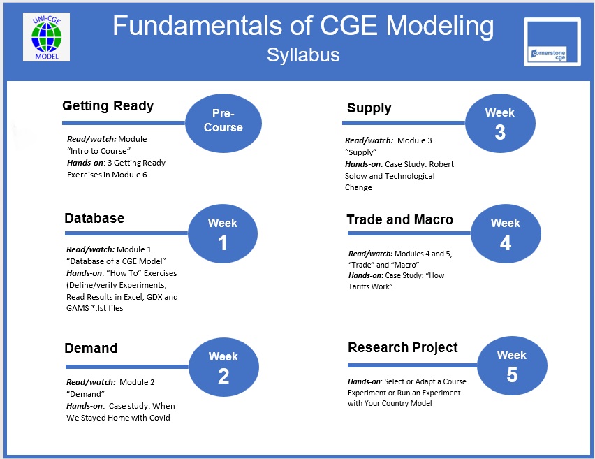 Cornerstone CGE is committed to building capacity in general equilibrium analysis, with a particular emphasis on helping teachers and learners overcome barriers to their participation in traditional CGE modeling training. To achieve this objective, Cornerstone CGE periodically provides a free, tutored experience of the course through Open University OpenLearn. This virtual course spans 6 weeks, with a small class size. It is an intensive course, requiring an average of 10-12 hours per week of study and practice, and sustained contributions to class discussions. Eligibility for enrollment is restricted to faculty and learners residing in low and lower middle-income countries, as defined by the World Bank. Applicants must provide a letter of recommendation.